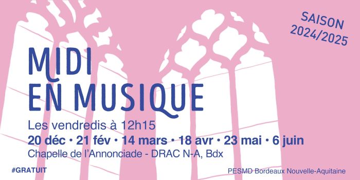 Devenu un rendez-vous incontournable des scènes publiques du PESMD, le MIDI EN MUSIQUE est de retour ! Ces concerts de musique de chambre sont donnés chaque mois par les étudiants du Pôle d’Enseignement Supérieur de Musique & de Danse de Bordeaux – toutes promotions confondues - dans le cadre de leur formation au Diplôme National Supérieur Professionnel de Musicien (DNSPM) et du Diplôme d’État (DE) de professeur de musique.